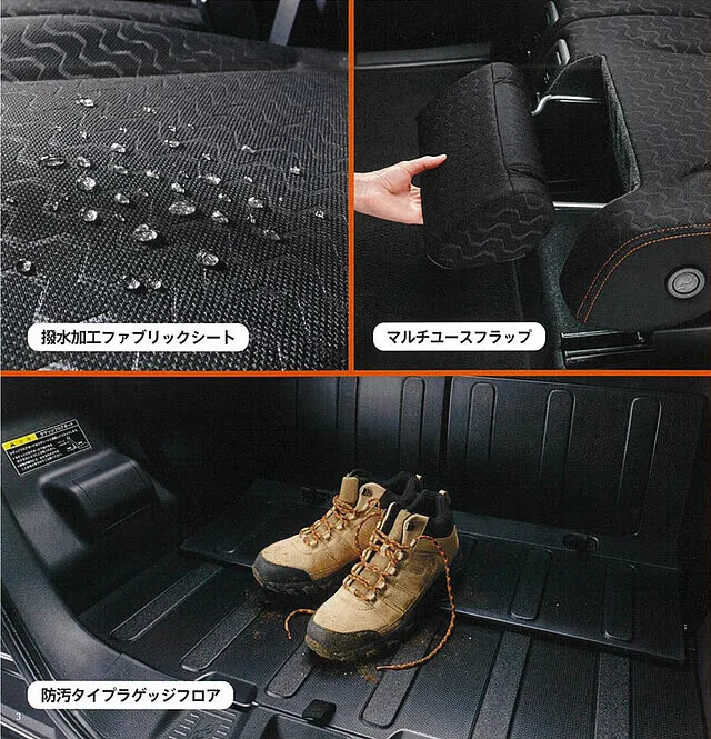 「新型スペーシア ギア」のインテリアは、撥水加工を施したファブリックシートや防汚タイプラゲッジフロアが採用されており、汚れが付きにくく落としやすい加工が施されています。
