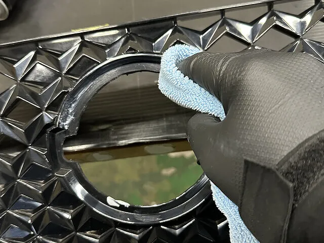 サクラエンブレムを取り付ける前に、取り付け位置を正確に測定。元の位置にしっかり合わせ、歪みなく貼り付けることが大切です。