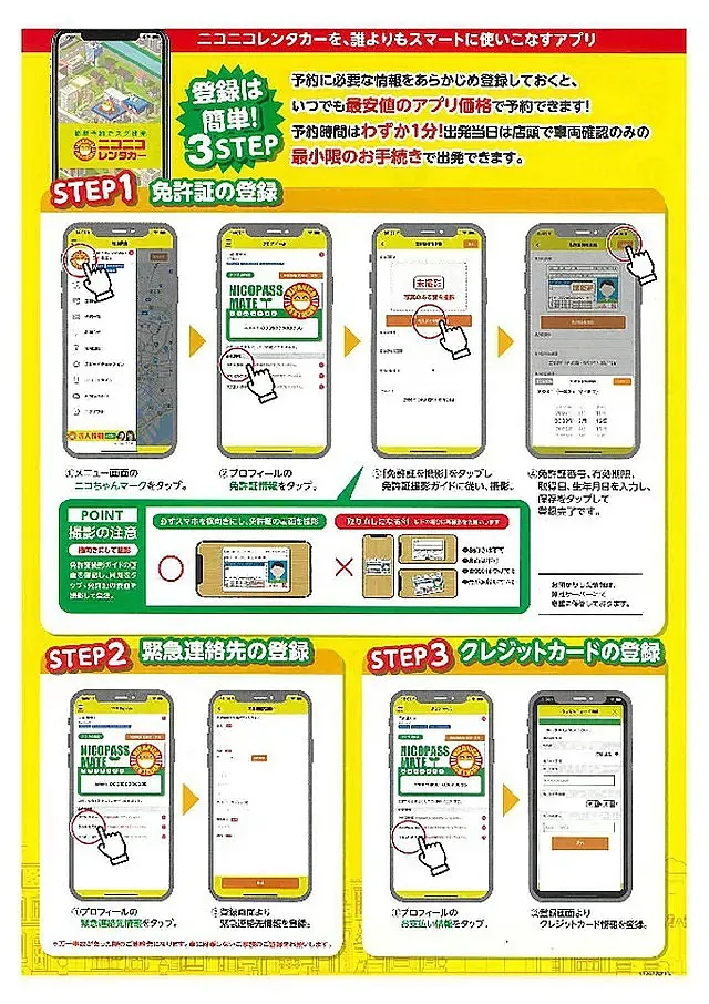 ・3ステップだけの手順で、会員登録が非常に簡単(免許証の登録・緊急連絡先の登録・クレジットカードの登録)
