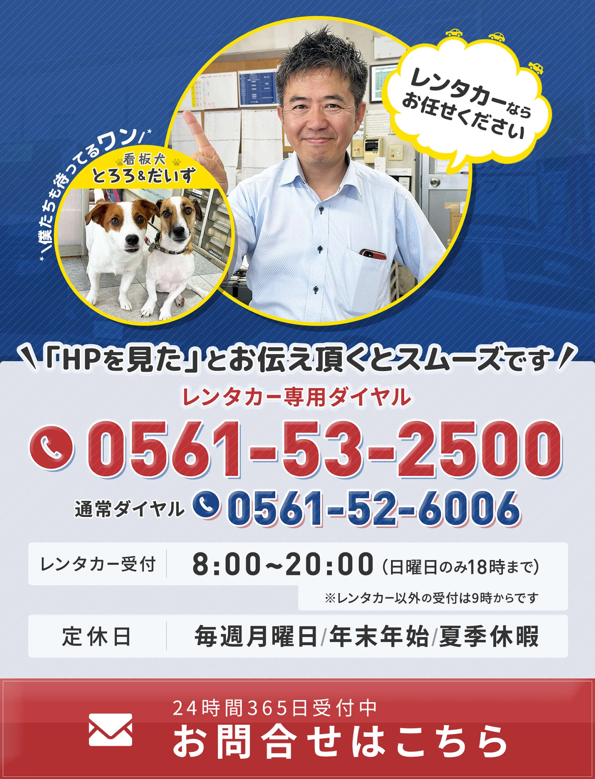 実は、ウェイクアップ(尾張旭渋川町店)のニコニコレンタカーが選ばれているのは、安さだけではないんです。困ったときに融通が利くと好評をいただいており、地域密着だからできる小回りさが自慢です。(お客様からのお声も紹介しています。)もちろん対応が難しい場合もございますが、一度ご相談いただければ精いっぱいお力になりますので、お気軽にお問合せください。