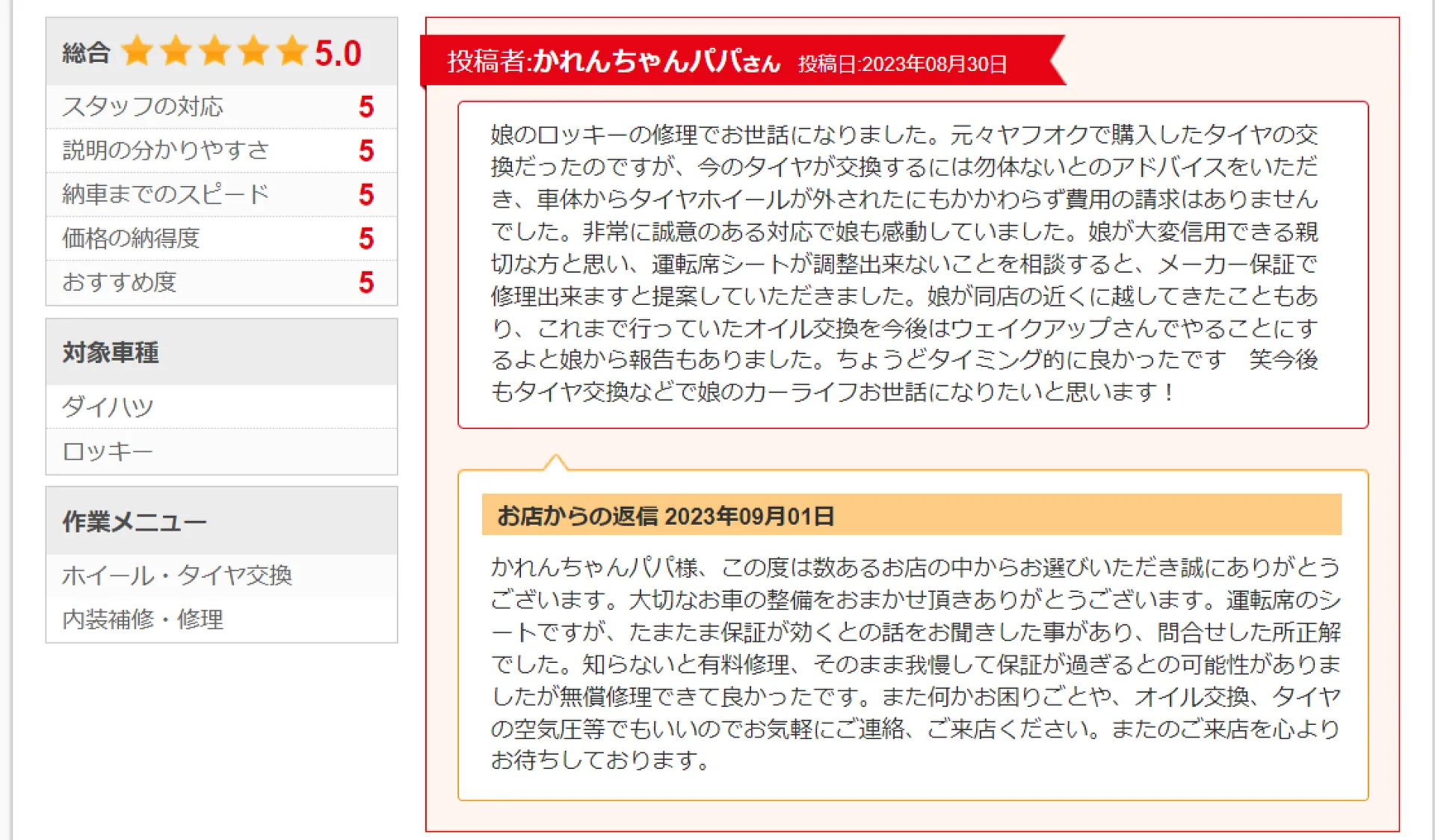1万台以上の豊富な対応実績があり、車検や法定点検もちろん、エンジンオイル交換やバッテリー交換、タイヤ交換などのメンテナンスまでお任せいただけます♪