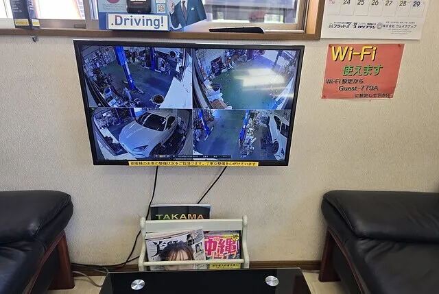 ウェイクアップの車検は、当社で診断後にさらに陸運局でもテストを実施。さらに待合室のモニターでお客様でもチェックをしていただけます。