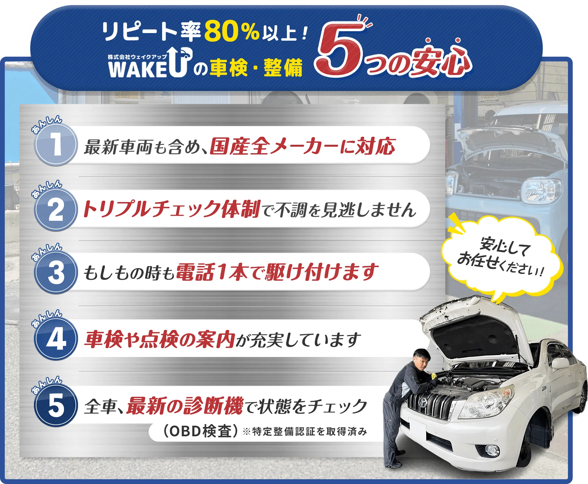 10000台以上の入庫実績、どなたでも安心の車検・車修理 | 尾張旭市 ウェイクアップ