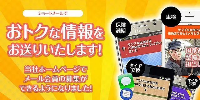 当社では、車検3ヵ月前や6ヵ月ごとのオイル交換のタイミングで、DMとショートメールをお送りしております!。