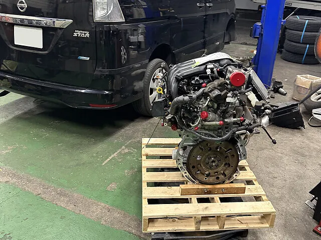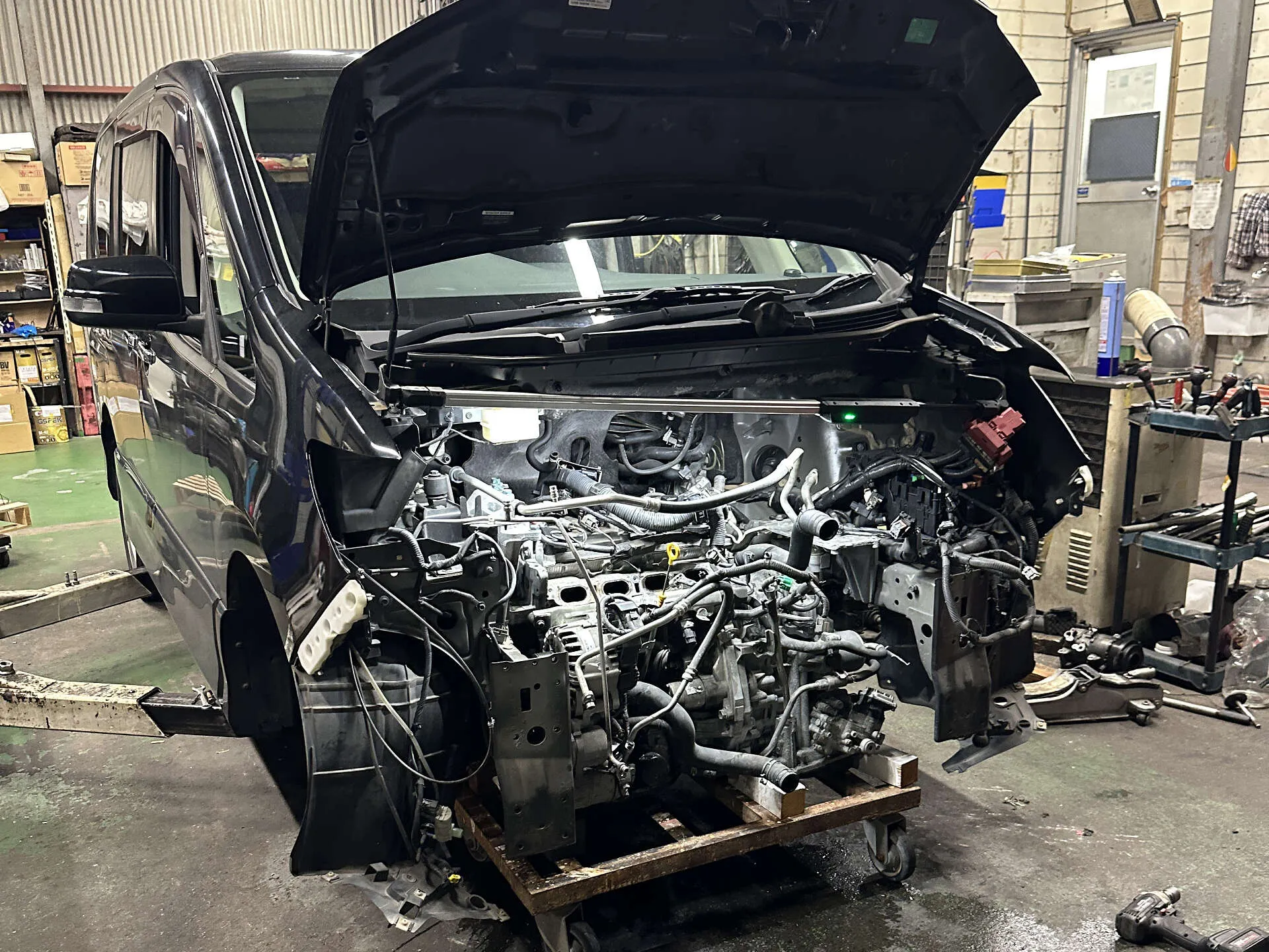 日産セレナのエンジン故障修理にあたり、エンジン交換を行いました。