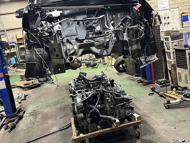 エンジン載せ替えにあたって、まずはフロントバンパーを外します。エンジンやミッションを下して、古いエンジンを取り外し。そこに新しいエンジンを取り付けていきます。