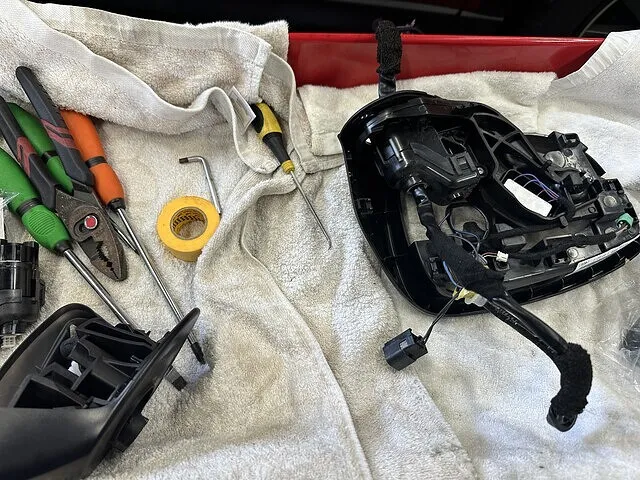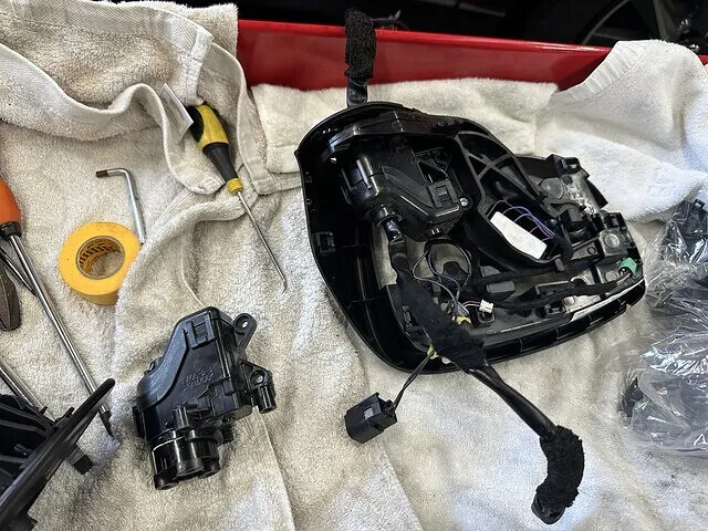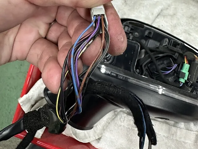 ドアミラーへの配線のコネクターを外し、ドアミラーを分解。モーターの交換を行い、ドアミラーを元通り組み立てたら配線やコネクターが正しく接続されているかチェックします。